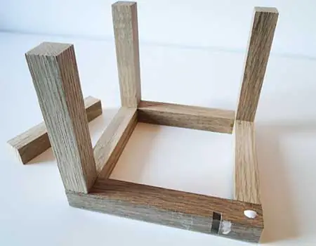 Umwickeln Sie die Ecken mit dem Klebeband, um diese aneinander zu pressen, bis der Leim vollständig ausgehärtet ist. Das dauert ca. 1 Stunde. Anschließend können Sie die übrigen 4 Leisten zwischen die beiden Rahmen anbringen, sodass diese einen Würfel bilden. Lassen Sie die verleimten Leisten erneut aushärten. Auch hier verwenden Sie am besten Klebeband zum Fixieren der verleimten Holzleisten.
