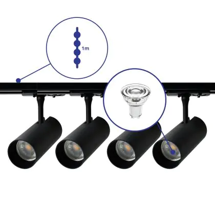 Beschreibung Komplettset 1-Phasen Rail 1 Meter Schwarz | incl. 4x Spot + GU10 2700K 3W Dimmbar + Abschlusskappe, Stromanschluss
