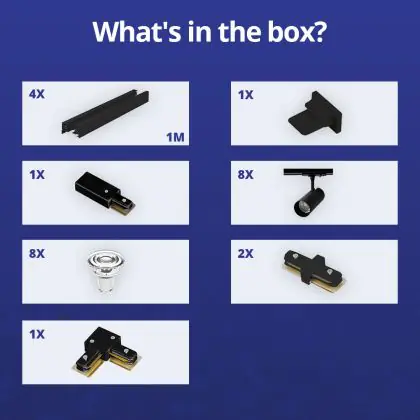 Beschreibung Komplettset 1-Phasen Rail L 2 x 2 Meter Schwarz | incl. 8x Spot + GU10 2700K 3W Dimmbar + Abschlusskappe, Stromanschluss und L -Verbinder