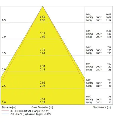 Beispiel: Wird eine Lampe mit einem Abstrahlwinkel von 60 Grad an der Decke (2,5 m Höhe) angebracht, erzeugt sie einen Lichtkegel von 2,9 Metern Durchmesser. Hat die Lampe hingegen einen Abstrahlwinkel von 120 Grad, beträgt der Lichtkegel 8,7 Meter im Durchmesser. |