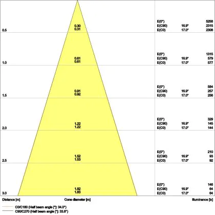 Beispiel: Wird eine Lampe mit einem Abstrahlwinkel von 60 Grad an der Decke (2,5 m Höhe) angebracht, erzeugt sie einen Lichtkegel von 2,9 Metern Durchmesser. Hat die Lampe hingegen einen Abstrahlwinkel von 120 Grad, beträgt der Lichtkegel 8,7 Meter im Durchmesser. |