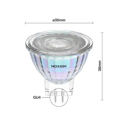 Die Noxion PerfectColor Led-Spot GU4 MR11 4.5W 345lm 36D - 927 Extra Warmweiß | Höchste Farbwiedergabe - Dimmbar - Ersatz Für 35W ist eine effiziente GU4 LED-Lampe und der perfekte Ersatz für Ihre konventionelle Halogenlampe mit 35W und einem GU4-Sockel, bei welchem die beiden Stifte einen Abstand von 4 mm zueinander haben. Die Stifte haben einen Abstand von 4 mm. Die Abkürzung MR11 steht für den Reflektordurchmesser von ca. 3,5 cm. Zudem strahlt das Produkt Licht in der Farbtemperatur 2700K - Extra Warmweiß aus und punktet durch eine lange Lebensdauer.