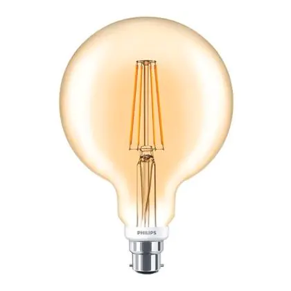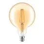 Die Philips Classic LED Globe B22 Fadenlampe Gold 120mm 7W 630lm - 820 Extra Warmweiß | Dimmbar - Ersatz für 40W ist eine effiziente B22 (Bajonettsockel) LED-Lampe mit Retrodesign und der perfekte Ersatz für Ihre konventionellen 40W Lampen mit B22 (Bajonettsockel). Zudem strahlt sie Licht in der Farbtemperatur 2000K - Extra Warmweiß aus und punktet durch eine lange Lebensdauer.